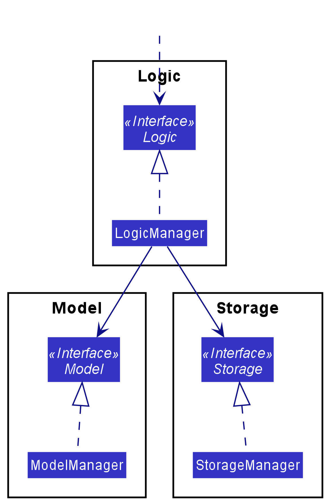 For example, the Logic component defines its API in the Logic.java interface and implements its functionality using the LogicManager.java class which follows the Logic interface. Other components interact with a given component through its interface rather than the concrete class (reason: to prevent outside component’s being coupled to the implementation of a component), as illustrated in the (partial) class diagram below.