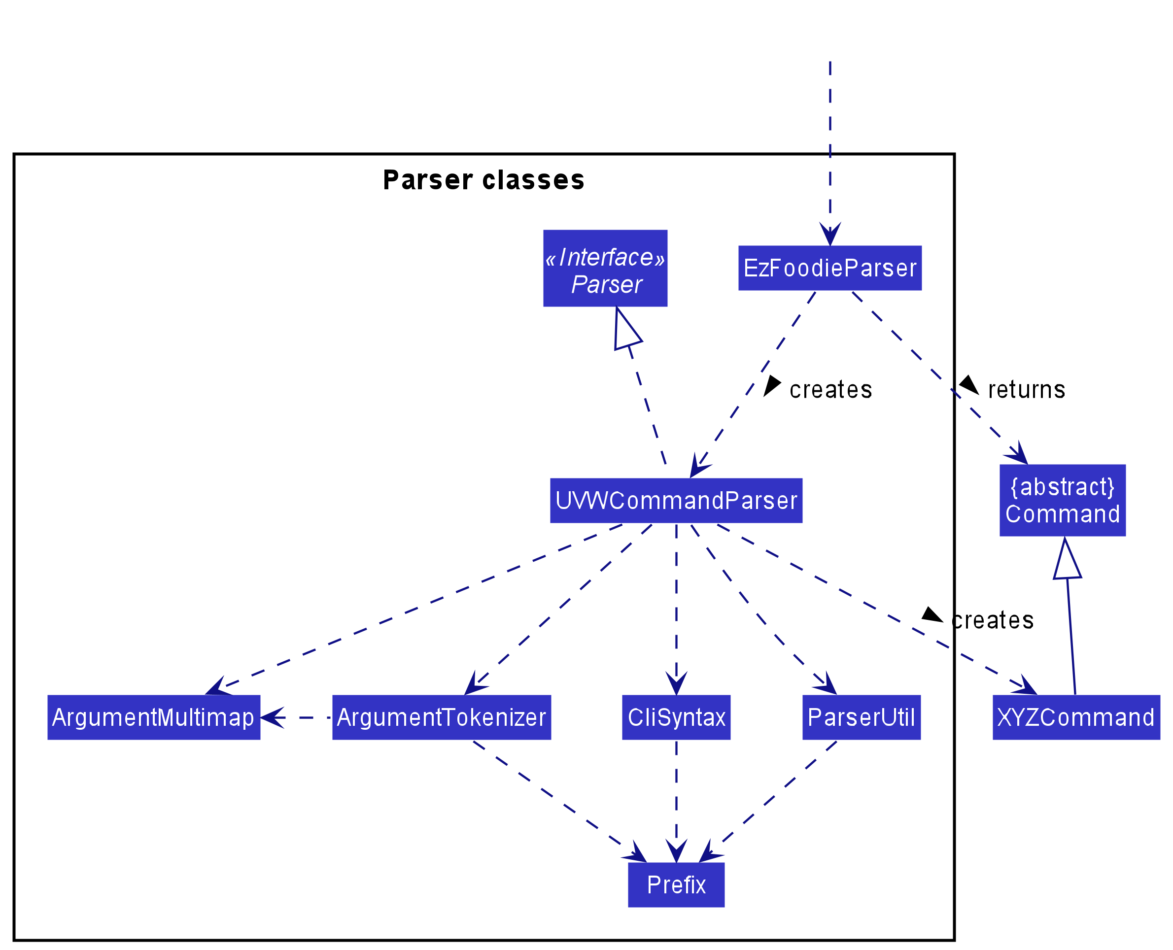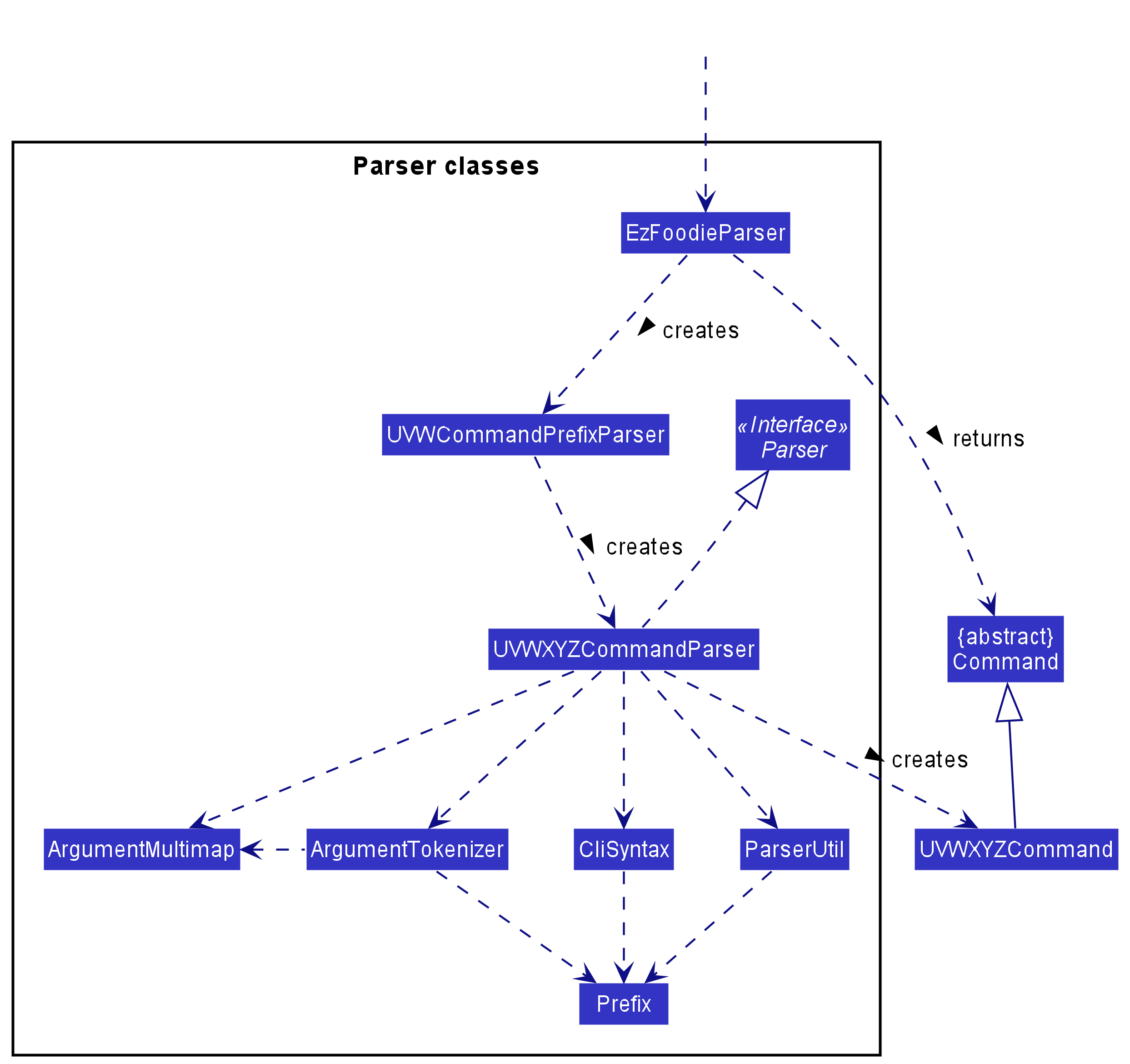 EzFoodieParserclass creates aUVWCommandPrefixParser(e.g.,AddCommandPrefixParser) which uses the other classes shown above to parse the user command by the specific object of the command (e.g.,member,transactionandreservationforAddCommandParsercorrespond toAddMemberCommandParser,AddTransactionCommandParserandAddReservationCommandParserrespectively) and create aUVWXYZCommandParserwhich extends fromUVWXCommandParser(e.g.,AddMmeberCommandParserextends fromAddCommandParser). - Then the
